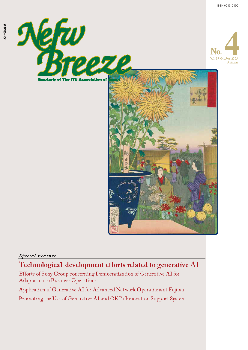 New Breeze 2025 Autumn 全文ダウンロード Special Feature — Technological-development efforts related to generative AI 1 Efforts of Sony Group concerning Democratization of Generative AI for Adaptation to Business Operations 8 Application of Generative AI for Advanced Network Operations at Fujitsu 12 Promoting the Use of Generative AI and OKI’s Innovation Support System Technology Trends 17 Measurement of RF-EMF levels around 5G Mobile Phone Base Stations 20 GPAI Tokyo Innovation Workshop 2025: Results Summary Column 24 = A Serial Introduction Part 1 = Winners of ITU-AJ Encouragement Awards 2025 Inside Back Cover & Back Cover 25 Nomination for the Director of the ITU Telecommunication Standardization Bureau
