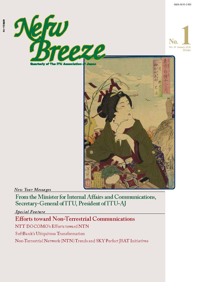 New Breeze 2026 Winter 全文ダウンロード New Year Messages 1 2026 MIC Minister's New Year's Greeting 2 New Year Message for New Breeze magazine, ITU Association of Japan 3 New Year's Message Special Feature — Efforts toward Non-Terrestrial Communications 4 NTT DOCOMO's Efforts toward NTN 8 SoftBank's Ubiquitous Transformation 13 Non-Terrestrial Network (NTN) Trends and SKY Perfect JSAT Initiatives —Toward a World That's Never Out of Range— Column 19 = A Serial Introduction Part 2 = Winners of ITU-AJ Encouragement Awards 2025 Inside Back Cover & Back Cover 21 Nomination for the Deputy Secretary General of the APT
